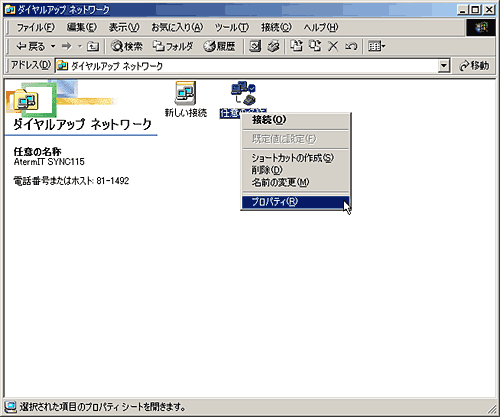 6. [ダイヤルアップネットワーク]に新しく作成された[任意の名称]アイコンを右クリックし、[プロパティ]メニューを選択します。